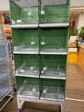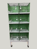 Green Breeding cage unit, set of 4 cages including a rolling stand with wheels. Includes dividers for maximum bird organization. Comes with custom feeders, water drinkers, and perches. Cages can be stacked or displayed separately. Easily detached for cleaning.