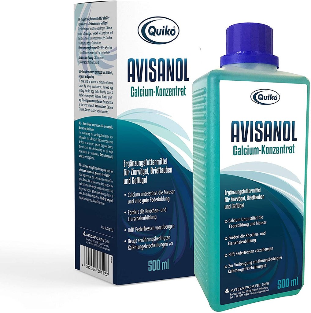 1 Teaspoon per 1 Liter water. 1 Teaspoon per 1kg Moist Food. A healthy drink all indoor birds will love. A Quiko Liquid Calcium for birds to keep them happy and healthy. Liquid Calcium is for all birds including parrots, pigeons and poultry to supplement a calcium deficiency. Calcium is essential for reduced egg binding. Healthy bone & feather development. Quality egg shells, reducing feather plucking use liquid calcium daily in drinking water or food to ensure perfect growth and bone development in young birds. Liquid Calcium improves feather condition, egg-shell development and helps prevent feather plucking in mature birds. All domestic / wild birds need Calcium and Quiko Liquid Calcium is the most effective way of administration.